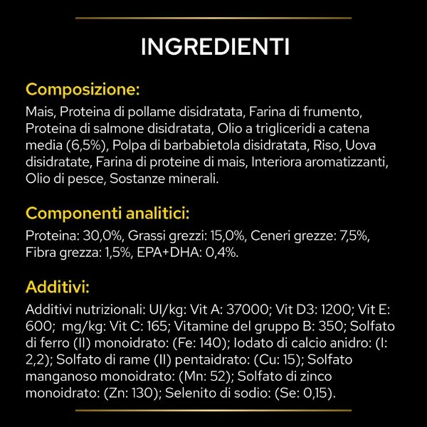 Composizione: Mais, Proteina di pollame disidratata, Farina di frumento, Proteina di salmone disidratata, Olio di trigliceridi a catena media (6,5%), Polpa di barbabetola disidratata, Riso, Uova disidratate, Farina di proteine di mais, Interiora aromatizzanti, Olio di pesce, Sostanze minerali.