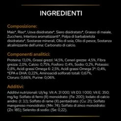 Componenti analitici: proteina: 13.0%, Grassi grezzi: 14.5%, Ceneri grezze: 4.5%, Fibra grezza: 2.0 %, Calcio: 0.75%, Fosforo: 0.4%, Sodio: 0.2%, Potassio: 0.8%, Acidi grassi Omega-6: 2.5%, Acidi grassi Omega-3**: 0.4%, **EPA e DHA: 0.22%, Aminoacidi solforati totali: 0.67%, Cloruro: 0.66%, Purine: 0.06%.