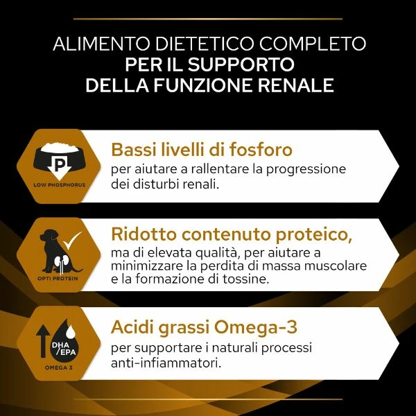 Purina pro plan veterinary diets renal function NF è un alimento dietetico completo per cani adulti per il supporto della funzione renale in caso di insufficienza renale cronica con ridotto tenore di fosforo e bassa concentrazione di proteine di elevata qualità. Crocchette light, ideali anche per la riduzione della formazione di calcoli di cistina e di calcoli di urati, con basso livello di proteine e proprietà alcalinizzanti dell’urina.