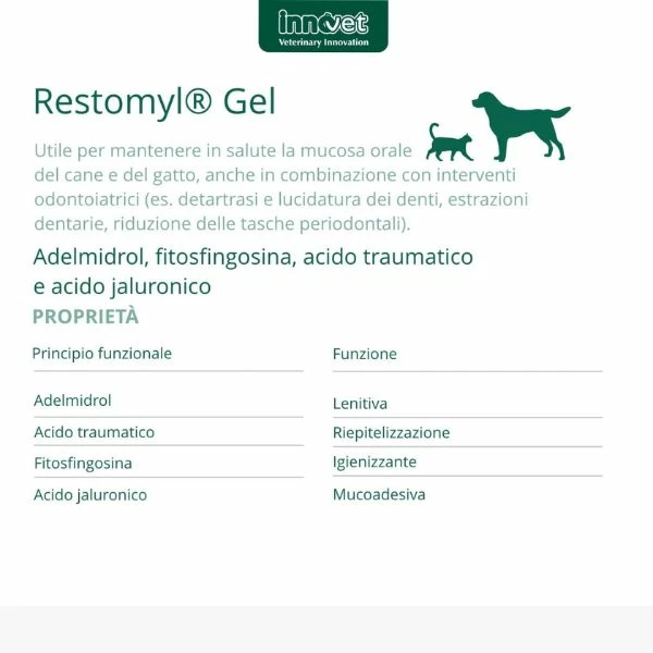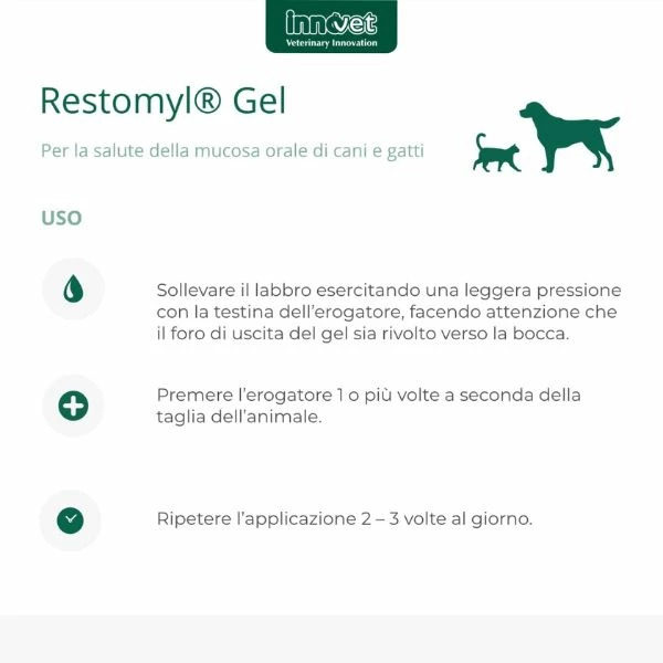 Restomyl gel Innovet può essere usato per favorire la normalizzazione delle mucose orali, in associazione ad interventi odontoiatrici specialistici (es. detartrasi e lucidatura dei denti, estrazioni dentarie, riduzione delle tasche periodontali). Può altresì rappresentare un utile complemento al trattamento delle parodontopatie su base infiammatoria e/o allergica, sia del cane (es. gengiviti, stomatiti, parodontiti) che del gatto (es. stomatite cronica felina), anche in presenza di ulcere oro-mucosali (es. ulcera indolente del gatto).