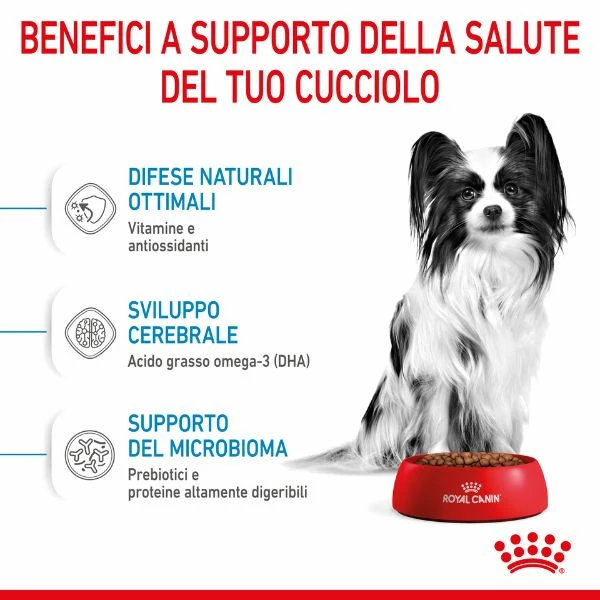 Royal Canin X-Small Junior è un alimento completo per cani fino a 10 mesi di vita e peso fino a 4 Kg. La sua formula esclusiva dona un apporto equilibrato di nutrienti e rinforza il sistema immunitario. Grazie a ingredienti come la combinazione di proteine e carboidrati, permette uno sviluppo armonioso, le vitamine e gli amminoacidi proteggono pelle e pelo, mentre le sostanze nutritive altamente digeribili e le fibre facilitano il transito intestinale. La Royal Canin ha sviluppato questo pasto pensando alle esigenze specifiche dei cani di piccola taglia in fase di sviluppo, oltre ad offrire il giusto apporto nutrizionale, permette una maggiore sicurezza digestiva e rinforza le difese immunitarie. Uso e Dosaggio: Questo prodotto è consigliato a cani di taglia piccola fino ai 4 Kg e oltre i 12 anni di età. Di seguito le dosi giornaliere consigliate: – età da 2 a 4 mesi: 70 Grammi di prodotto – età da 5 a 7 mesi: 65 Grammi di prodotto – età da 8 a 10 mesi: 55 Grammi di prodotto.