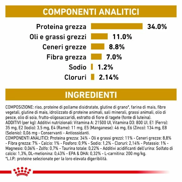 È anche indicato per le malattie dell’apparato urinario inferiore dei felini. Il suo moderato contenuto