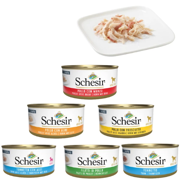 Schesir Dog 150 gr è un alimento umido per cuccioli e cani adulti di tutte le taglie preparato con ingredienti della massima qualità. Arricchito con vitamine per renderlo nutrizionalmente più completo, è preparato con animali allevati con mangimi naturali e ne vengono utilizzate solo le parti pregiate senza ossa, pelle e parti sanguigne. La ricetta Schesir è a base di carne o pesce selezionati e preparati in gelatina, per un pasto sfizioso e originale.