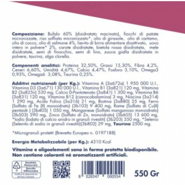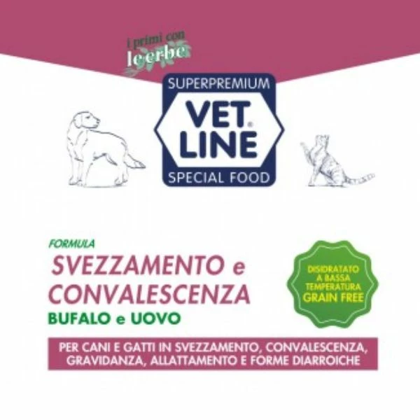 Vet Line Grain Free Svezzamento e Convalescenza Alimento disidratato Bufalo e Uovo è un alimento crudo liofilizzato, utile per il periodo di svezzamento e per animali debilitati. Il prodotto è stato sviluppato per fornire un’alimentazione nutriente e di facile digestione.