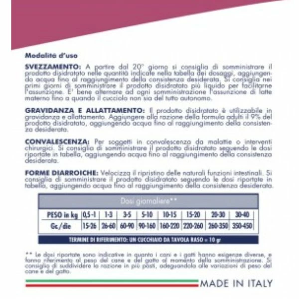 - Forme diarroiche. Velocizza il ripristino delle naturali funzioni intestinali. Si consiglia di somministrare il prodotto disidratato seguendo le dosi in tabella, aggiungendo acqua fino al raggiungimento della consistenza desiderata.