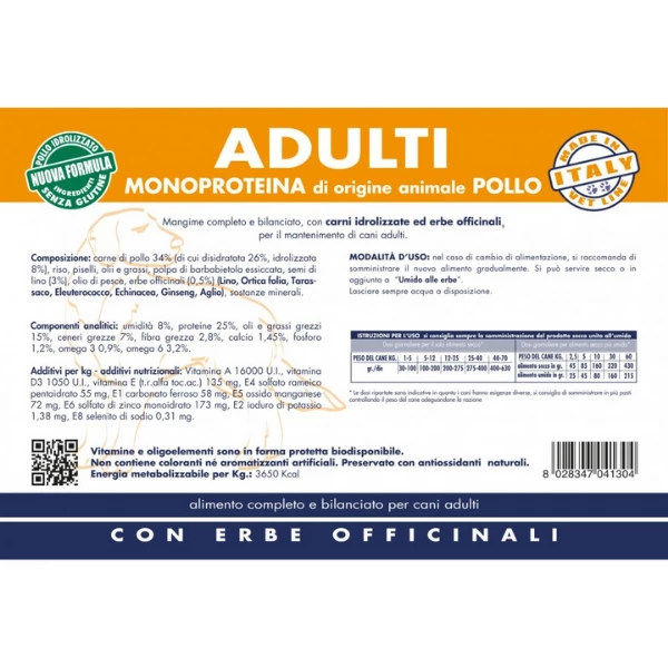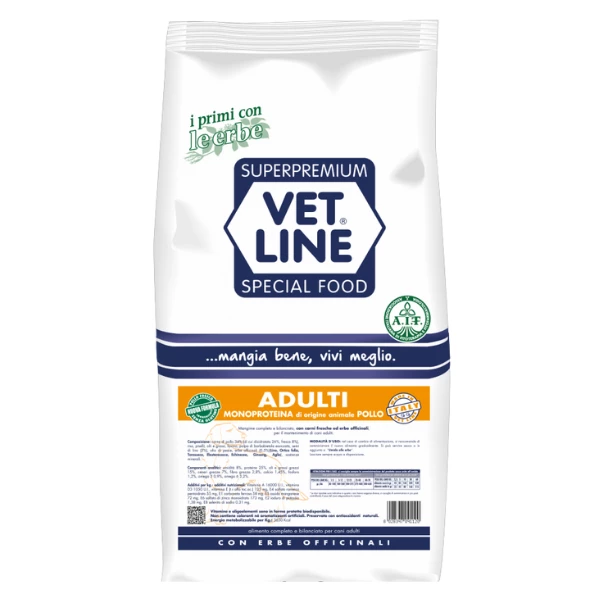 Vet Line Secco Monoproteico Cane Adult Pollo è un mangime secco completo e bilanciato, con carni idrolizzate ed erbe officinali, per il mantenimento di cani adulti.